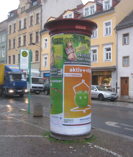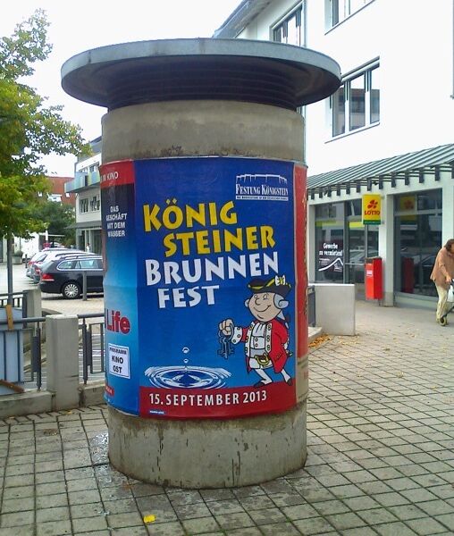 Die Plakatierung von DIN A1 (59,4 cm x 84 cm) Tafeln an Lichtmasten ist eine der werbewirksamsten Formen der Plakatierung. Diese sind jedoch überwiegend genehmigungspflichtig. Für gemeinnützige Vereine gelten besondere Regelungen in fast allen Gemeinden. Die Tafeln werden doppelseitig oder einzeln am Lichtmast befestigt und sind kombinierbar mit anderen Medien. Der regelmäßige Aushang ist individuell planbar und wird somit auf Ihre Veranstaltung abgestimmt.