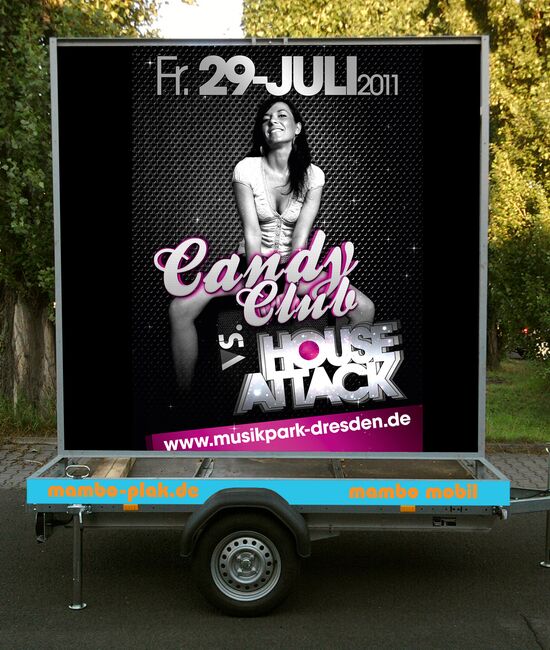 Das Mambo Mobil - der ortsunabhängige Eyecatcher jetzt in 3er oder 5er Flotten bundesweit einsetzbar. Die beiden, ideal für 14 tägige Kampagnen buchbaren, 6 qm großen Flächen, bilden die perfekte Ergänzung zur klassischen 18/1tel Präsentation. Ob Einzelhandel, Telekommunikationsanbieter, Wahlkampf oder aber auch für Aktionen über Land - seine Stärke ist die Flexibilität.